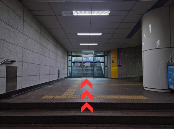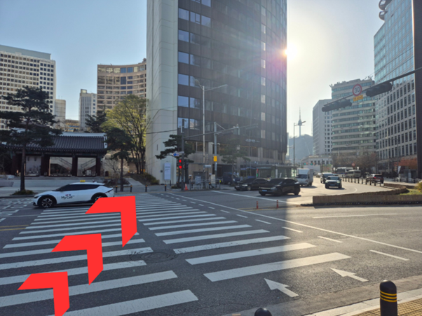 6번출구 앞에서 바로 광장 쪽으로 횡단보도 건너기 횡단보도 건너자마자 오른쪽으로 20~30m 정도만 직진하시면 넓은 횡단보도가 있습니다. 횡단보도를 건너주세요
